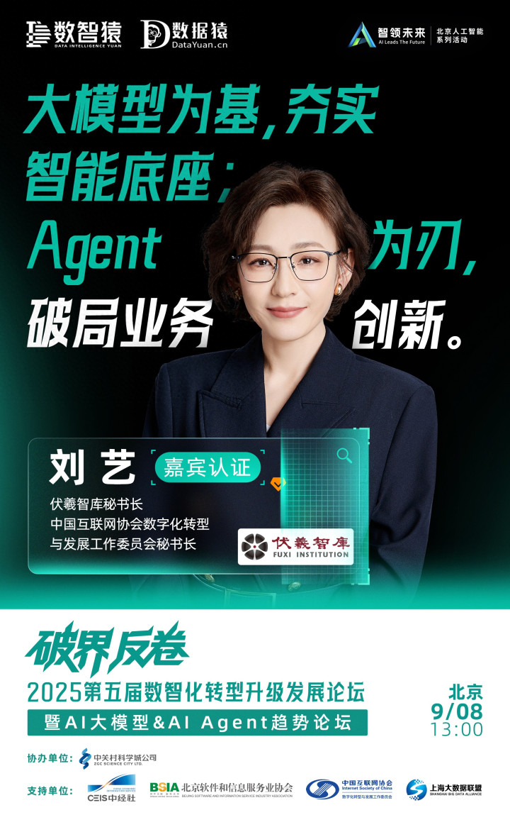 伏羲智库秘书长 刘艺,已确认出席由数智猿×数据猿联合主办,中关村科学城公司协办,新华社中国经济信息社×北京软件和信息服务业协会×中国互联网协会数字化转型与发展工作委员会×上海大数据联盟作为支持单位的“2025第五届数智化转型升级发展论坛——暨AI大模型&AI Agent趋势论坛”。